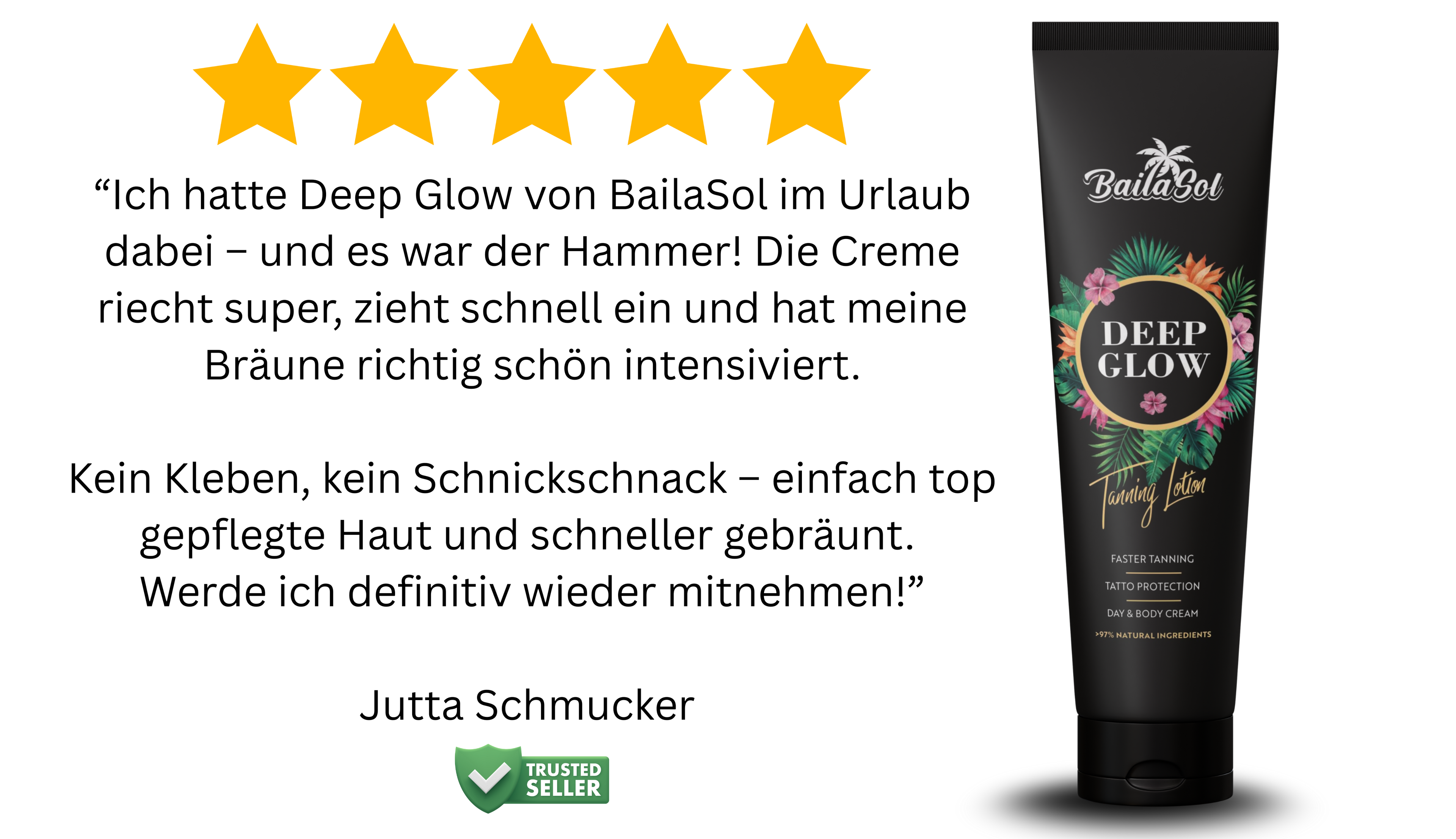 Ich hatte Deep Glow von BailaSol im Urlaub dabei – und es war der Hammer! Die Creme riecht super, zieht schnell ein und hat meine Bräune richtig schön intensiviert. Kein Kleben, kein Schnickschnack – einfach top gepflegte Haut und schneller gebräunt. Werde ich definitiv wieder mitnehmen!